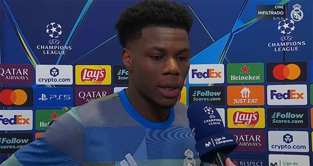 欧冠1/8决赛首回合,皇马在主场3-0完胜曼城,中场大将楚阿梅尼赛后在混合区接受了俱乐部官网的采访。